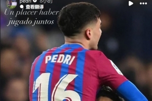 佩德里社媒曬出與阿爾巴慶祝的合照,配文:“很榮幸曾與你并肩作戰(zhàn),場(chǎng)上的偉大球員,場(chǎng)下的天才人物?!?/p>