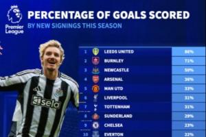 體育資訊10月9日訊 新賽季英超已經(jīng)進(jìn)行了7輪比賽,20支球隊(duì)今夏新援作用如何?德國(guó)轉(zhuǎn)會(huì)市場(chǎng)盤點(diǎn)了各隊(duì)新援進(jìn)球數(shù)占球隊(duì)總進(jìn)球數(shù)的比例情況,其中利茲聯(lián)86%最高,阿森納、曼聯(lián)、利物浦分列位居第4、第5和第6。