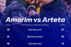 體育資訊10月11日訊 天空體育對(duì)比了阿莫林執(zhí)教曼聯(lián)前50場(chǎng)比賽,與阿爾特塔執(zhí)教阿森納的前50場(chǎng)戰(zhàn)績(jī)對(duì)比,具體如下(各項(xiàng)賽事):