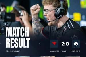 易邊再戰(zhàn),手槍局FaZe全員來B,寒王與總監(jiān)各取雙殺,F(xiàn)aZe拿到第11分。次回合Spirit強起守住B點,donk拿到AK第15回合雙殺,Spirit將比分追至11-5。回到長槍,F(xiàn)aZe三顆煙霧彈強打A點得手,donk拆包未果,F(xiàn)aZe拿到賽點。最終donk與Sh1ro先送首殺,F(xiàn)aZe輕松13-5拿下圖二淘汰Spirit,晉級半決賽。