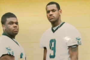 詹姆斯轉(zhuǎn)發(fā)了媒體rare_sports發(fā)布的他和高中隊友Sian Cotton身穿圣文森特圣瑪麗高中橄欖球隊球衣的合照。