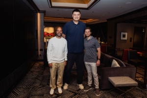 “和兄弟們?cè)谝黄疣?。拉斐爾很開心和姚明見面?!辟M(fèi)利西亞-斯通在圖片旁邊寫道。