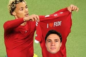 ?;倏藭癯鲎约涸趯﹃嚹习财疹D的比賽中脫衣慶祝的照片,并在球衣上加上了小基耶薩的頭像,并配文“我??費(fèi)德(費(fèi)德里科-基耶薩的昵稱)”。