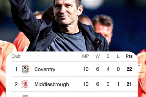 考文垂本賽季前10場(chǎng)英冠6勝4平保持不敗,在積分榜上以1分優(yōu)勢(shì)領(lǐng)先米德爾斯堡位居榜首,球隊(duì)10場(chǎng)比賽打進(jìn)29球(聯(lián)賽最多),只丟7球(已經(jīng)連續(xù)5場(chǎng)零封)。