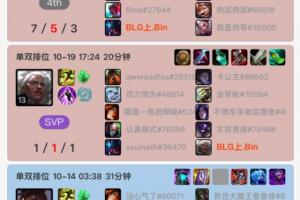體育資訊10月19日訊 BLG上單Bin自14號凌晨后在今天再度開啟韓服Rank,使用一把挖掘機(7-5-3),一把狼母(1-1-1),兩把全負。