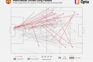 據(jù)Opta統(tǒng)計,曼聯(lián)本場比賽傳球294次,其中有75次長傳,占比25.5%、2017年12月3-1擊敗阿森納(占比27.9%)之后,這是曼聯(lián)在英超長傳占比最高的比賽。