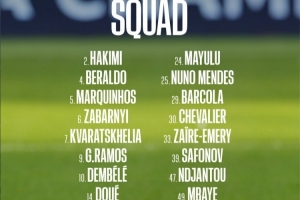 前鋒:7-克瓦拉茨赫利亞、9-貢薩洛-拉莫斯、10-登貝萊、14-杜埃、19-李剛?cè)省?9-巴爾科拉、恩賈恩圖、49-姆巴耶