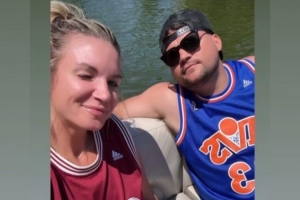 目前的Spectrum SportsNet湖人女記者Allie Clifton曬出自己與老公在身穿詹姆斯騎士球衣的合影慶?!扒蛞氯铡?。