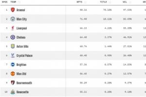 曼城本輪輸紐卡!大數(shù)據(jù)預(yù)測英超奪冠概率:阿森納升至70.18%領(lǐng)跑