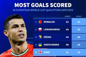 歐洲世預(yù)賽歷史射手榜:C羅52場(chǎng)41球居首,哈蘭德14場(chǎng)21球第7