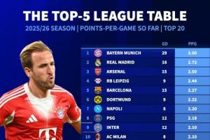 全勝+凈勝29球!5大聯(lián)賽場均積分榜:拜仁3分居首,皇馬槍手列2-3