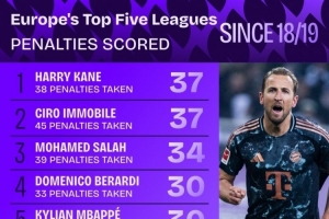 18-19賽季以來五大聯(lián)賽點射進球榜:凱恩、因莫比萊37球居首