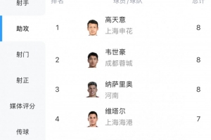 中超助攻榜:韋世豪、納薩里奧追平高天意,8次并列榜首