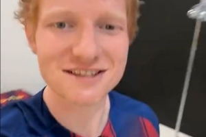 體育資訊10月26日訊 今晚西甲迎來國家德比,英國著名歌手艾德-希蘭穿巴薩球衣助威。