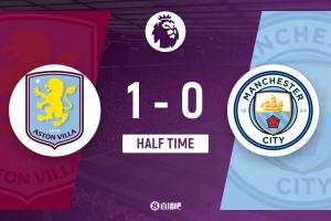上半場(chǎng)傷停補(bǔ)時(shí)3分鐘,半場(chǎng)結(jié)束,曼城暫0-1維拉。