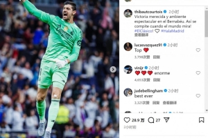 皇馬門將庫爾圖瓦社媒曬照慶祝勝利,配文:“實(shí)至名歸的勝利,伯納烏球場的氛圍震撼人心,在舉世矚目的比賽中就該有這樣的表現(xiàn)!”