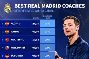 體育資訊10月27日訊 皇馬在本輪西甲焦點戰(zhàn)2-1力克巴薩,阿隆索帶隊延續(xù)了出色的戰(zhàn)績。德轉(zhuǎn)數(shù)據(jù)統(tǒng)計顯示,阿隆索執(zhí)教皇馬的前10輪西甲拿分并列歷史第一。