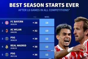 體育資訊10月27日訊 拜仁在本輪德甲焦點戰(zhàn)3-0完勝門興,延續(xù)了賽季開局全勝戰(zhàn)績,也追平米蘭的五大聯(lián)賽球隊單賽季各項賽事開局連勝紀(jì)錄?!掇D(zhuǎn)會市場》也統(tǒng)計了五大聯(lián)賽球隊歷史的單賽季各項賽事前13場比賽的勝場情況。