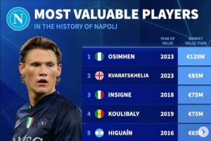 體育資訊10月28日訊 德國轉(zhuǎn)會市場統(tǒng)計了那不勒斯隊史的身價前10球員,奧斯梅恩位列第一。