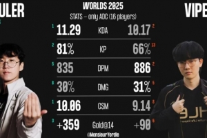 Ruler在KDA、參團(tuán)率、分均補(bǔ)刀、14分鐘對位經(jīng)濟(jì)差方面多項(xiàng)領(lǐng)先,而Viper在分均輸出、傷害占比方面較為領(lǐng)先。