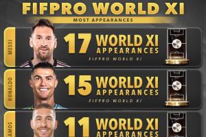 FIFPRO年度最佳陣入選次數(shù)前10: