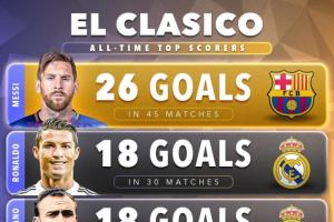 國(guó)家德比歷史射手榜,梅西26球遙遙領(lǐng)先,C羅、迪斯蒂法諾18球并列第2,本澤馬16球,勞爾15球,TOP5僅1名巴薩球員。