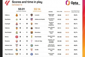 本輪西甲凈比賽時(shí)長(zhǎng)最多的是馬洛卡vs萊萬(wàn)特,為59分17秒;凈比賽時(shí)長(zhǎng)最短的則是巴列卡諾vs阿拉維斯,僅48分31秒。