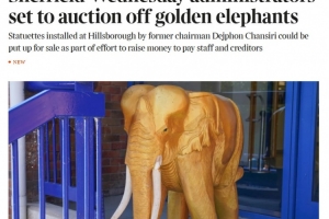 體育資訊10月28日訊 據(jù)《泰晤士報(bào)》報(bào)道,進(jìn)入托管狀態(tài)的謝周三俱樂(lè)部正采取多種措施籌集資金,托管人準(zhǔn)備拍賣(mài)掉前主席錢(qián)西里安放在希爾斯堡球場(chǎng)的兩尊標(biāo)志性金象雕像。這些雕像因擔(dān)心被球迷破壞或盜竊已被移至室內(nèi)。
