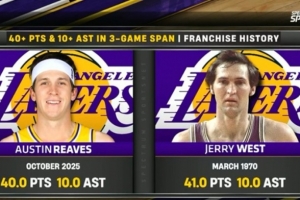 在最近的三場比賽中,里夫斯場均得到40分10助攻,隊(duì)史第二人,比肩杰里-韋斯特。