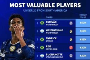 體育資訊10月30日訊 《轉(zhuǎn)會市場》統(tǒng)計了南美籍U20球員身價情況,切爾西新星埃斯特旺領跑。