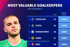 體育資訊11月1日訊 德國(guó)轉(zhuǎn)會(huì)市場(chǎng)統(tǒng)計(jì)了門將的身價(jià),并列出榜單,多納魯馬、科貝爾、拉亞等5人并列居首。