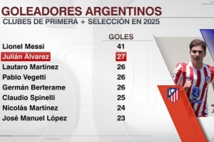 進入2025年,阿爾瓦雷斯在俱樂部和國家隊已打進27球,阿根廷球員中僅次于梅西的41球。在阿爾瓦雷斯身后是勞塔羅(26球)、維格蒂(26球)、貝爾泰拉梅(26球)、斯皮內(nèi)利(25球)、尼古拉斯-馬丁內(nèi)斯(24球)以及何塞-洛佩斯(23球)。