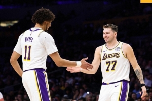 賽后,湖人官方社媒分享贏球海報,并寫道:“洛杉磯今晚很吵?!焙笊?,東契奇和海斯擊掌慶祝。