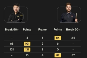 本場比賽,周躍龍轟出兩桿破百和兩桿50+,??反虺鑫鍡U50+。雙方前八局比賽打成4-4平,最后??愤B勝兩局拿下比賽勝利。
