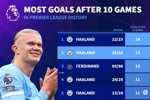 在德轉(zhuǎn)列出的英超歷史前10輪進(jìn)球榜中,前五哈蘭德占據(jù)四席,22-23賽季前10輪進(jìn)14球,為歷史最多。