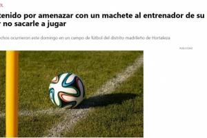 據(jù)馬德里高級(jí)警察總局通報(bào),事件發(fā)生在本周日,位于馬德里奧爾塔萊薩區(qū)的一處足球場(chǎng)附近。被捕者與其兒子的足球教練發(fā)生激烈爭(zhēng)吵,多名目擊者向警方證實(shí)該男子曾手持砍刀作出暴力姿態(tài)。