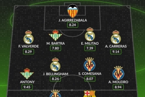 中場:安東尼(貝蒂斯,9.45分)、貝林厄姆(皇馬,8.24分)、康薩尼亞(比利亞雷亞爾,8.07分)、莫萊羅(比利亞雷亞爾,8.94分)