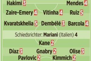 體育資訊11月5日訊 巴黎在本輪歐冠焦點(diǎn)戰(zhàn)主場(chǎng)1-2不敵拜仁,馬爾基尼奧斯送禮、迪亞斯雙響后染紅,《圖片報(bào)》在賽后為兩隊(duì)進(jìn)行了評(píng)分:(1分最佳、5分最差,6分相當(dāng)于負(fù)分)