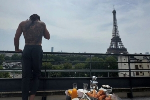 戈登曬出自己在巴黎的照片,他赤裸上身遙望埃菲爾鐵塔,身旁擺放著豐盛的餐食。