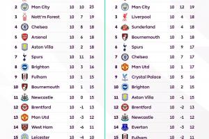 體育資訊11月06日訊 英超官方社媒更新動態(tài),官方曬出了24/25賽季和本賽季聯(lián)賽在10輪過后的積分榜情況,并配文:你注意到了什么?