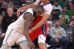 >>又一個受害者??杰倫·布朗撞到K·喬治發(fā)際線粉全粘白" />