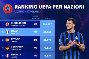 各國聯(lián)賽歐戰(zhàn)總積分排名(近5個(gè)賽季):