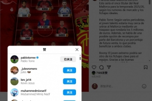 托雷明確表態(tài)只愿加盟馬略卡,并拒絕了阿賈克斯等歐洲其他俱樂(lè)部的邀約。事實(shí)上,他在社交媒體上點(diǎn)贊相關(guān)動(dòng)態(tài)的舉動(dòng)已引發(fā)關(guān)注。Instagram賬號(hào)aficionrcdm發(fā)布的馬洛卡下賽季潛在首發(fā)陣容中,托雷作為前腰與薩姆-科斯塔、塞爾吉-達(dá)德?tīng)柦M成中場(chǎng)三角,而球員本人對(duì)該帖的點(diǎn)贊行為進(jìn)一步點(diǎn)燃了球迷熱議。