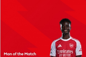 英超官方在賽后宣布,薩卡以33%得票率被球迷票選為本場比賽的全場最佳球員。