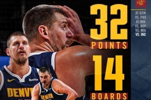 賽后,掘金官方發(fā)布約基奇數(shù)據(jù)海報(bào),并寫道:“這些都是他在32分鐘里做到的??”