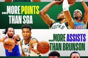 美媒Clutchpoints列出了有趣的對比,比得分字母哥場均得分高于亞歷山大的33分,比助攻多過布倫森的6.1次,比三分命中率他比庫里的38.9%要高(字母哥場均出手為1.6次)。