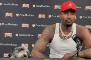 賽后,德拉蒙德帶著他的愛犬鮑勃·馬利來到比賽現(xiàn)場,這只狗狗和他一起坐在新聞發(fā)布臺上。