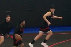 視頻當(dāng)中,楊瀚森接球上籃打進(jìn),開(kāi)拓者眾將輕松備戰(zhàn)氛圍融洽。