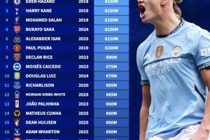 體育資訊11月12日訊 德國轉(zhuǎn)會(huì)市場(chǎng)盤點(diǎn)了英超各隊(duì)歷史身價(jià)最高球員,哈蘭德以2億歐居首,阿扎爾、凱恩、薩拉赫和薩卡均為1.5億歐。
