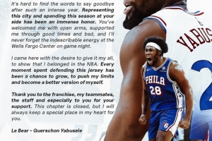 “親愛的費城,經(jīng)歷了如此密集的一年后,要說再見真的很難。能夠代表這座城市,為你們而戰(zhàn)度過這個賽季,是無上的榮耀。你們張開雙臂歡迎我,在順境與逆境中都支持我,我永遠(yuǎn)不會忘記每個比賽之夜,我們主場那難以言喻的能量。